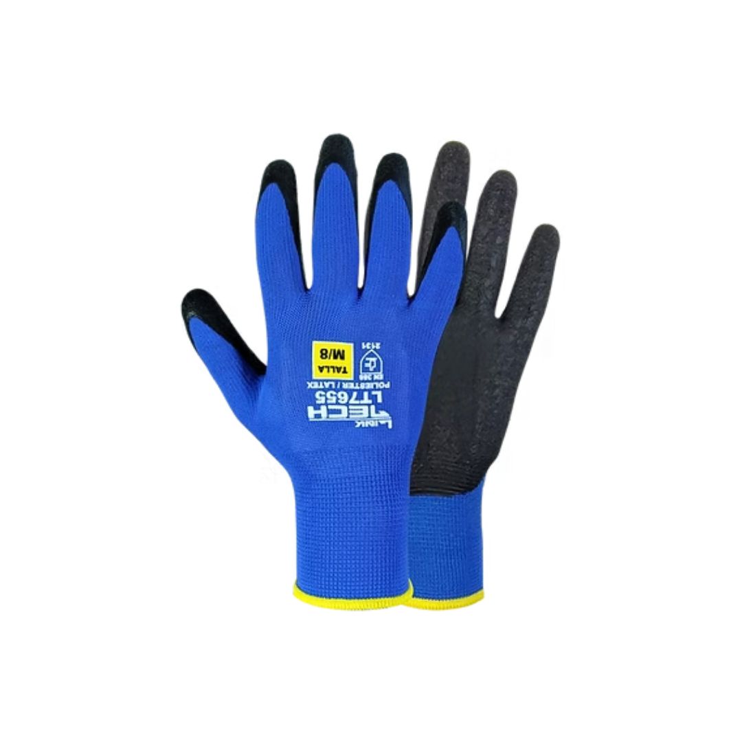 | Material | Tejido de poliéster sin costuras. Palma y dedos recubiertos de látex negro arrugado. |